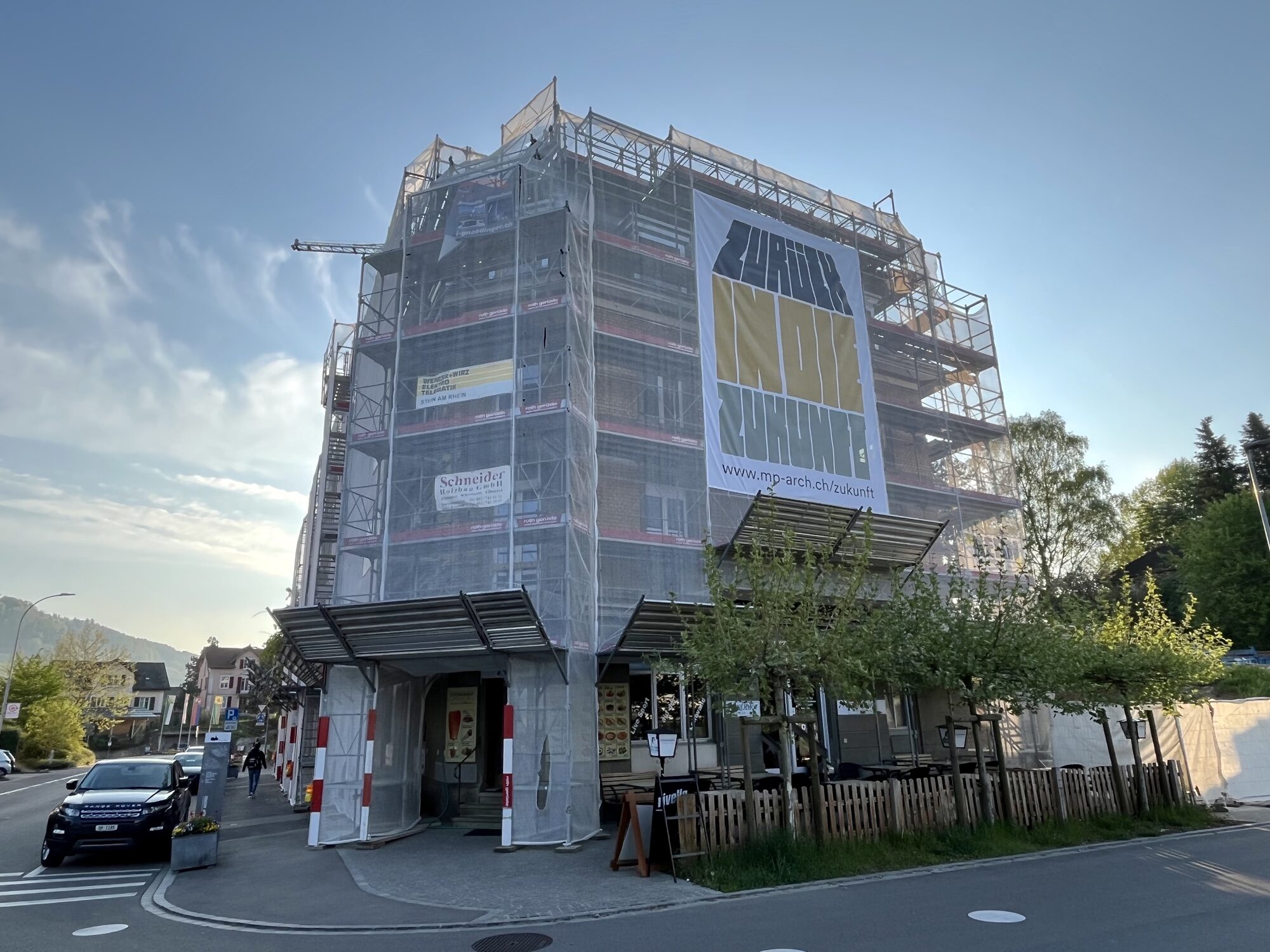 Aktuell befindet sich unser denkmalgeschütztes Bürogebäude «Steinerhof» im Umbau und trägt die grosse Aufschrift «Zurück in die Zukunft». Durch die Totalsanierung erhält das Gebäude sein stattliches Erscheinungsbild zurück und präsentiert sich bald mit modernisiertem Innenleben. Nach den Umbau- und Sanierungsarbeiten wird der Nordteil als Geschäftshaus dienen. Im Südteil bleibt die Gastronomie bestehen und es entstehen vier Wohnungen mit neuen Balkonen.